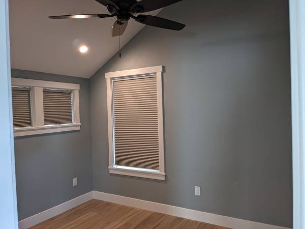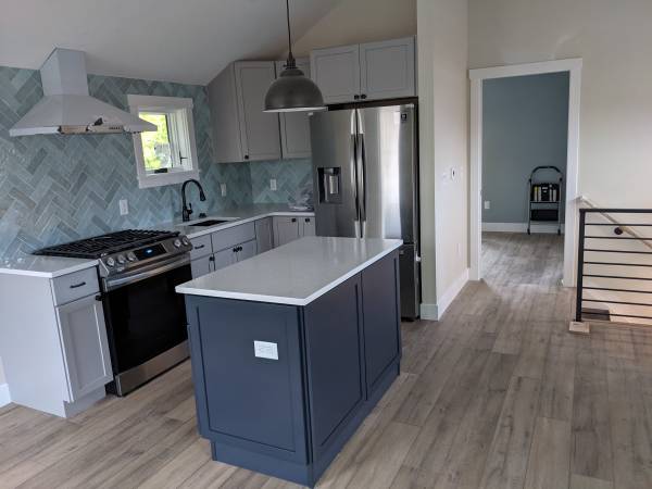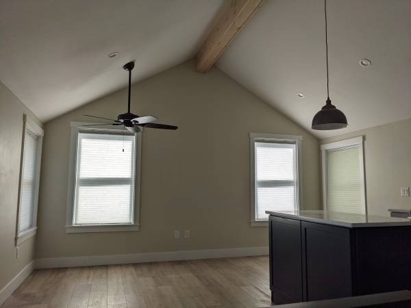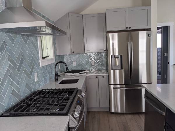 The ADU is bright and open, with high ceilings and large windows through the combined living/kitchen space. It features radiant floor heating, ductless AC cooling, and high-end appliances (gas stove, 36" fridge, DW, W/D).