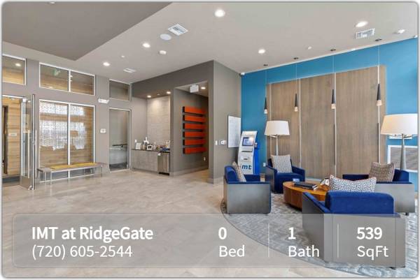 IMT at RidgeGate is a commuter's dream. Situated in the Sky Ridge Station TOD subarea, which is bound by I-25, Lincoln Avenue, Park Meadows Boulevard and Sky Ridge Avenue. Just east of the new Charles Schwab Campus, north of Sky Ridge Medical Center, and west of the future RTD Sky Ridge lines. IMT at RidgeGate offers an oasis to the city life with luxury interior finishes such as hard-surface flooring, stone countertops, stainless appliances, kitchen backsplashes and open floorplans with 10-foot ceilings. It also offer common area amenities including a fitness center, yoga room, club room, library, conference room and an outdoor patio that will be located on top of the parking structure with amazing views of the Front Range. The large courtyard includes a resort-style pool with custom water features, cabanas, a large spa and a covered, fully-equipped outdoor kitchen.