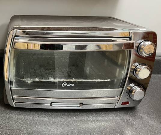 Silver Oster toaster oven with one adjustable rack. Perfect for your kitchen counter and great for reheating, small-batch baking, etc. 2 oven mitts and 3 pot holders included.