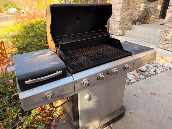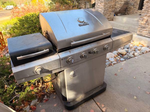 Char-Broil designer series grill with side burner for sale. Parents moving and their grill has a rotisserie so we don’t need this one. Starter button works, grill works, side burner never used. Cover included. Grill is 60”wide, 20” deep, and 46.5” high