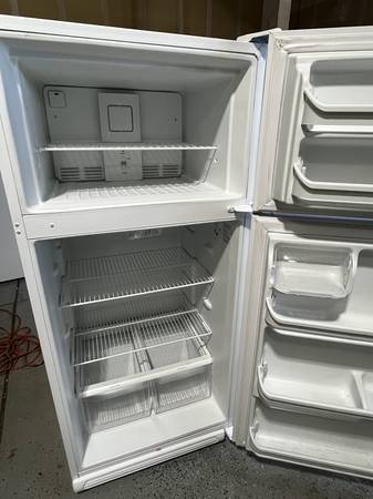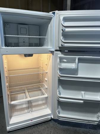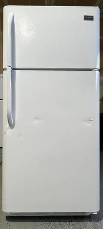 Frigidaire top-freezer refrigerator, model FFTR1814QW4A (manufactured 02/2016). Fully working, runs cold, and SUPER clean—perfect for kitchen, garage, or backup use.