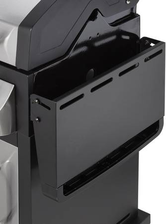 Double wall stainless steel lid assembly to retain heat includes temperature gauge; Side shelves with integrated towel bar and tool hooks