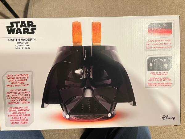 Like new never used in box. Toaster makes light saber sound effects and glows red underneath. Also makes Darth Vader breathing sounds. Perfect for the Star Wars Fan in your life! First come first...