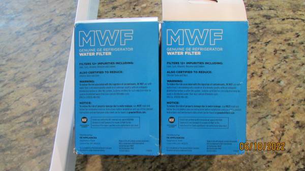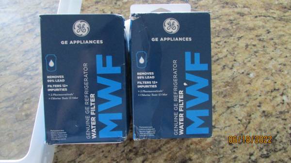 Genuine OEM GE Refrigerator MWF Water Filters. Qty—2, NIB and still sealed in plastic wrap! Genuine OEM Part # MWFPRC, Item # 3024481. Price--$20 or $10/each.
