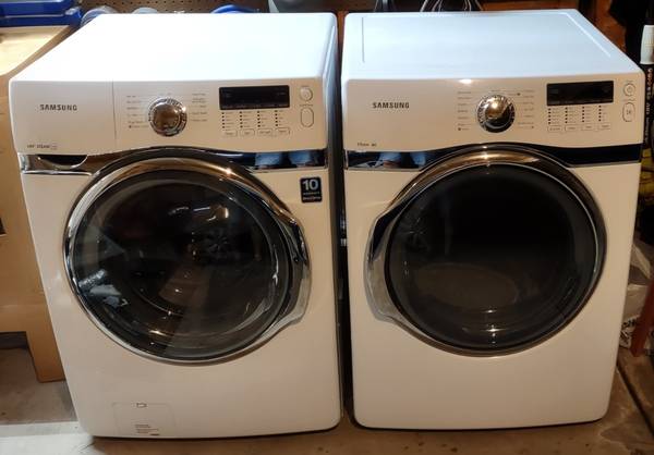Samsung large capacity size washer and electric dryer set, includes washer hoses and dryer electric cord, 12 years old, washer has 10 cycles and dryer has 12 cycles both works very well. $450 for...