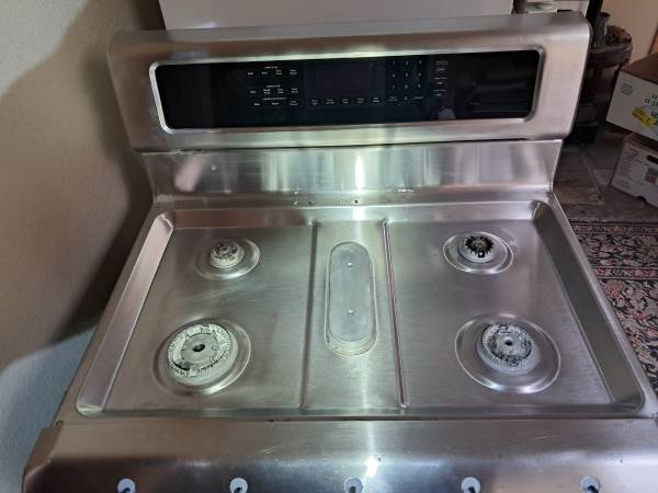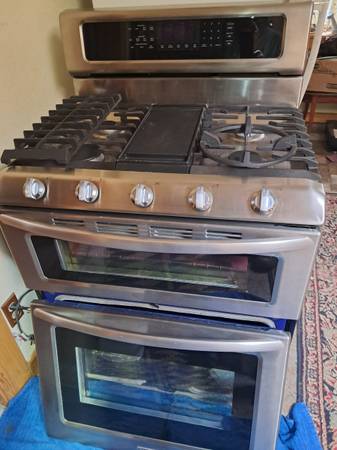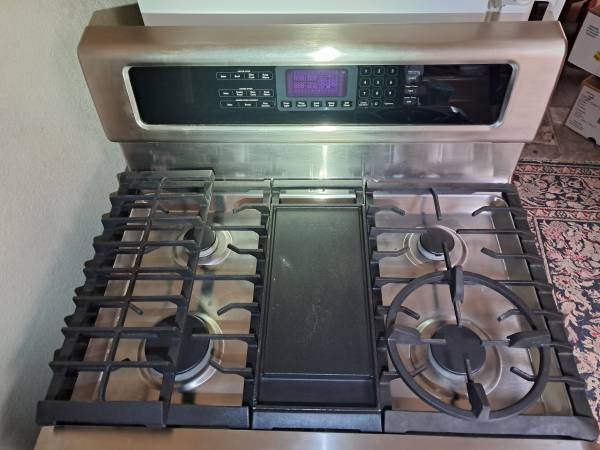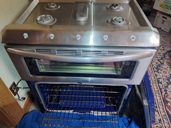 Selling, Kitchen Aide , 30-Inch 5 Burner Dual Fuel Double Oven Convection Range. I bought this for a Kitchen remodel that never happened. Now I would like to move it on to new owner, that will actually use it. Stove was not purchased clean by previous owner, so I spent a bit of time cleaning it up it needed it. As you can see by the picture this stove has been used little and is in excellent shape. I am including a link to a comparable model, however newer. You can see that Kitchen Aide has made few changes to this design and that brand new these stoves sell for alot. This is NG, unit and I do not see a conversion parts for LPG. You would have to call Kitchen Aide to see if there is one. I can not find the serial #, it shows it should be inside the oven top door all I see is a place where a label has been burned of. This stove is heavy, you can see that the front bottom door is removed. It is not broken it is a feature that enables you remove both the upper and lower doors , partly to cut down on the weight when moving and it also makes cleaning it alot easy. I am sure this is a good stove, I also plugged in the unit to see if the full display works and yes it does. If you see, This stove as an ad on CL , Then yes "It is still Available " Hoping to find a good home for this stove. Thanks.