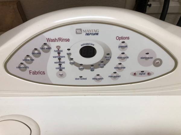 Top-loading Maytag Neptune washing machine and a matching Maytag Neptune dryer with an area above for wrinkle removal, refreshing , etc.