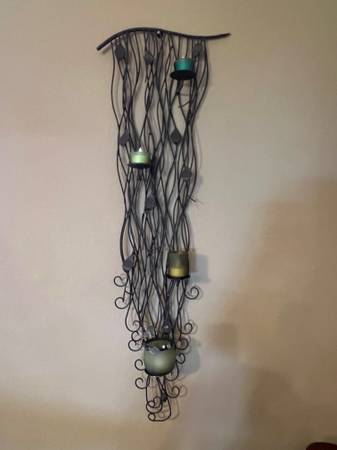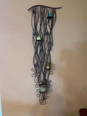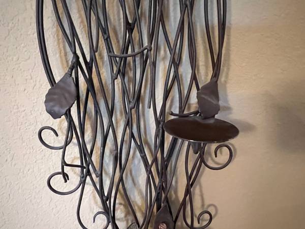 Iron Metal Wall Decor and Candle Holder. Organic design makes a beautiful statement on any wall. Metal rounds to hold candles or any other fun display piece. The colored tea candle holders are what we used. You're welcome to have them or use your own.