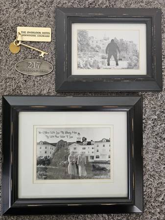 #2 Framed printed pieces from the Stanley Hotel "The Overlook" 12.25" x 10.25" and 9.5"x 7.5" #2 Metal pieces, keychain and door number