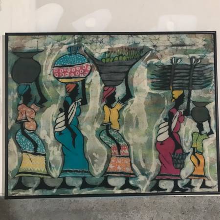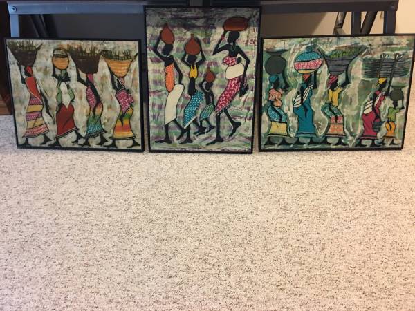 Three professionally framed Tanzanian Batiks. Frames are black metal.