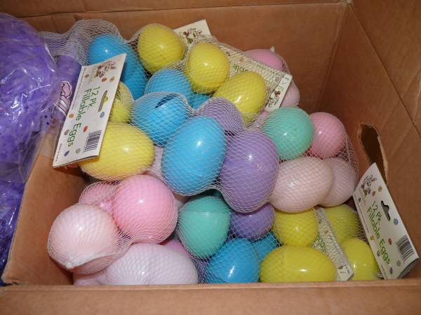 I have a large box of Easter fillable eggs and pastel colored grass I have 24 bags of the grass and 14 packages of eggs. The eggs are packages of 12 large eggs. All are new in the package.