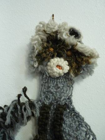 The head has a metal circle, dull wood beads for the eyes and a shiny wood bead for the nose