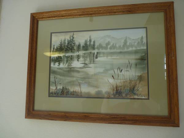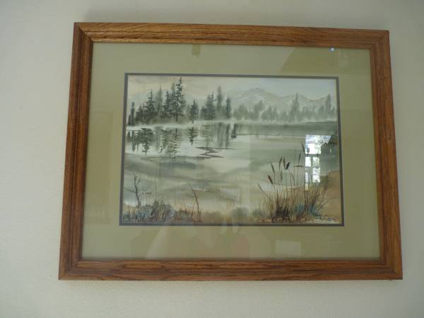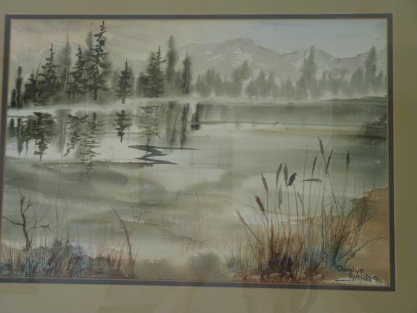 A calm vision of a mountain lake. Mountains are in the background. Evergreens line the water on the back edge with a bird sitting on the fore gound amount the reeds.