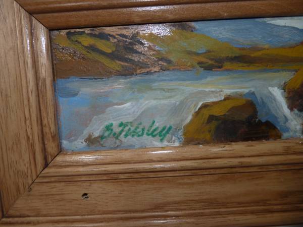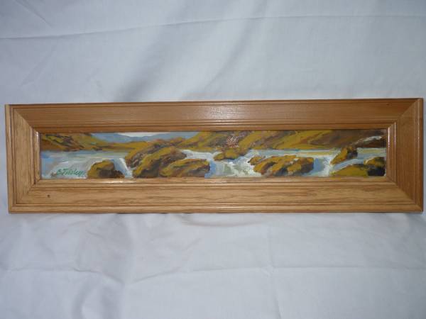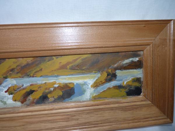 This painting is colorful earth tone water scene and beautiful. This piece is painted on a cupboard door in such a way as to allow the outer part of the panel to act as the frame. The scene is a steam with rocks in the middle. In the distance is a hint of the Rocky Mountains. The piece is signed B. Tilsley. Bruce Tilsley is an Arvada, Colorado Artist.