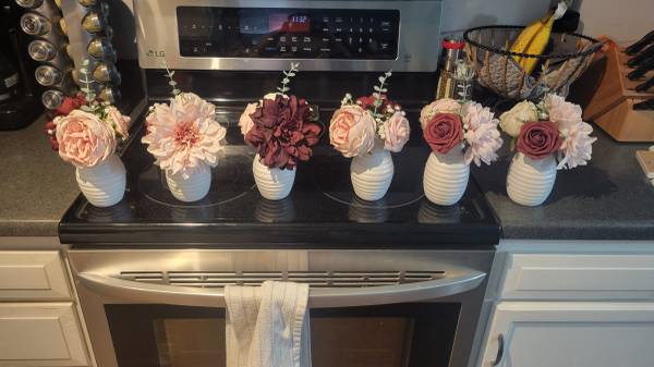 8 total vases w/ flowers (6 are smaller and are white/silver glitter, 2 are just white and are a little bigger)