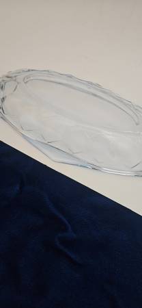 This lovely hexagonally shaped bowl measures almost 9" x 4-1/2" x almost 2" high and is perfect condition. It is a lovely light blue and has an oblong shape to it, with a diamond pattern around the sides. It has the typical "C" embossed in a triangle on the bottom, as does typical Cambridge ware.