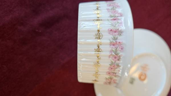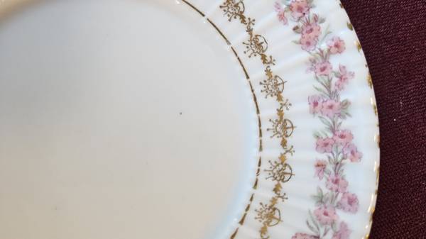 Lovely porcelain set, made for and imported by Burley & Company of Chicago. It is decorated in the pink rose pattern with fluted edges and gold trim.