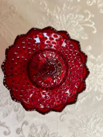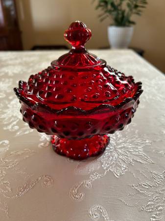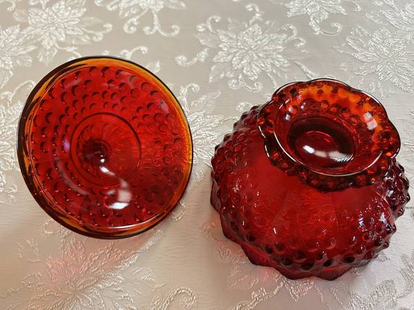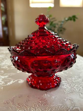 Gorgeous ruby red hobnail covered candy dish made by Fenton. Sturdy red glass that glows two tone amberina in the sunlight. No chips or cracks. 7 inches wide by 7 inches tall.