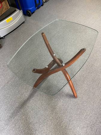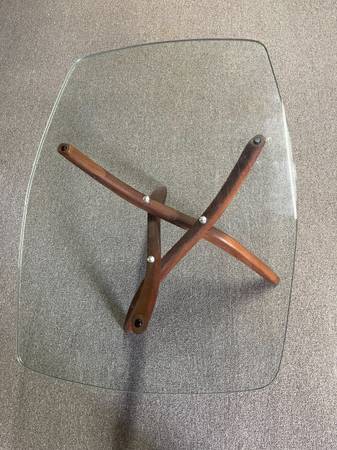 I have two Forest Wilson end tables - they are matching rectangular-shaped. They are made of walnut and glass and measure 27" wide x 20" deep and 21" high, times two. The glass on one of the rectangular tables looks to be in perfect shape while the other one has a very minor chip on the underside. The imperfections in the glass aren't that noticeable as you can tell by the aerial pictures. The walnut bases are in great shape. These are your very "classic" mid-century modern tables that would look great in any room I'm only asking $800 for both. Cash only.