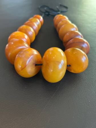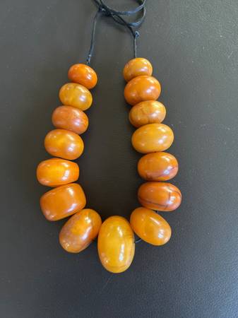 Gorgeous antique African amber graduated bead necklace on black silk rope.