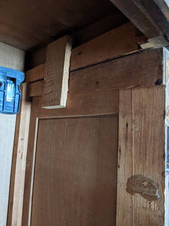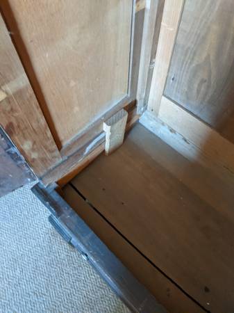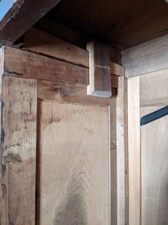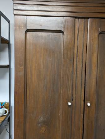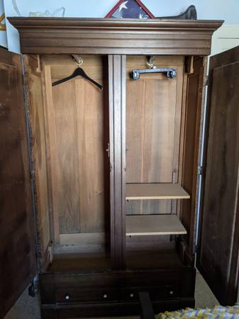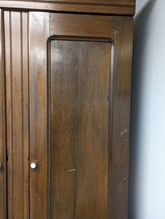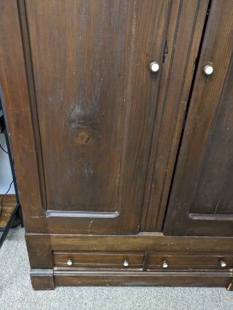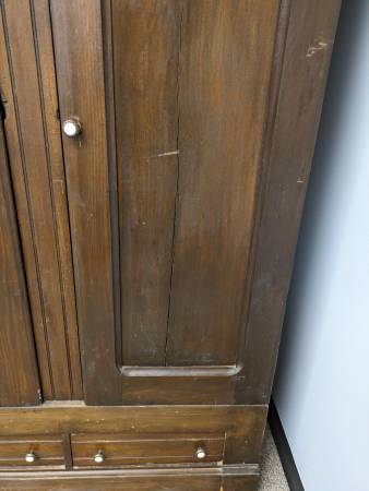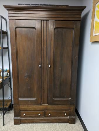 antique cherry knockdown wardrobe 2 drawers on the bottom has been rods for hanging clothes and and shelves have been added in the 1990s Dimensions: Crown 19" deep 49" wide body is 16 1/2" deep 80"...