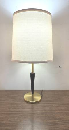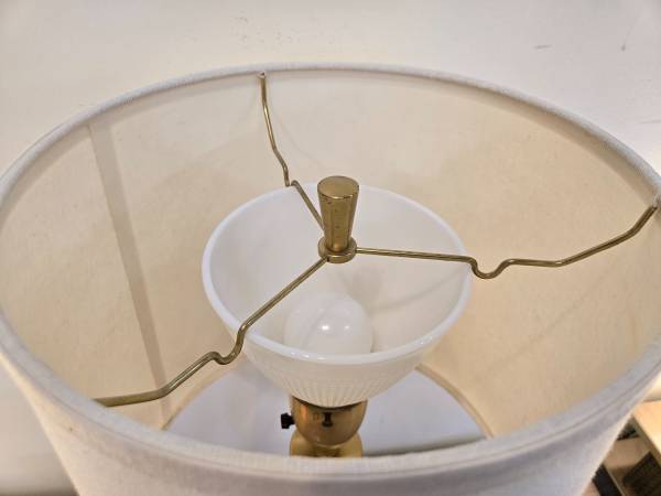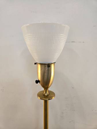 This lamp was probably made somewhere in the 1940s to 1950s, giving it an Art Deco look but getting close to Mid-century Modern. The use of the textured, milk glass torchiere shade on top is the classic Rembrandt accent that gives the Art Deco look. It will direct the light upward, where it will beautifully reflect off the ceiling and walls. This lamp came with the cloth shade, which is included, but in my opinion, it hides the best part of the lamp. You can tell the shade is probably original to the lamp by the way it sits on the torchiere shade. The base and part of the neck is brass. There is a tapered black section in the middle, that after deliberation, I believe is painted metal. On the socket is the original Rembrandt Lamp Company sticker.