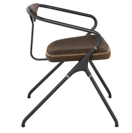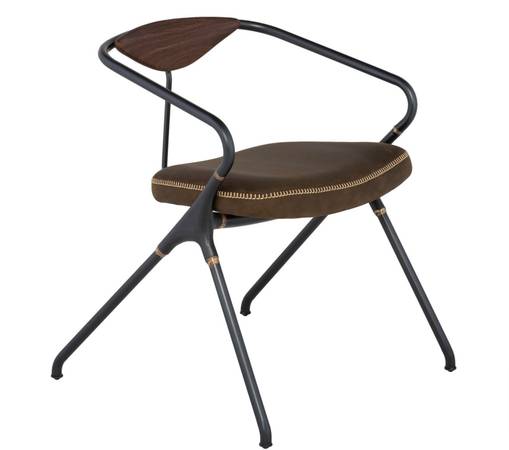 The Akron dining chair employs the minimum of materials to create a fluid functional original. It features a bent steel frame connected with brass brazed cast iron supporting a leather seat and a solid oak backrest.