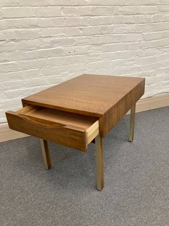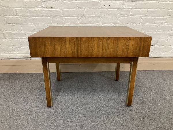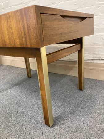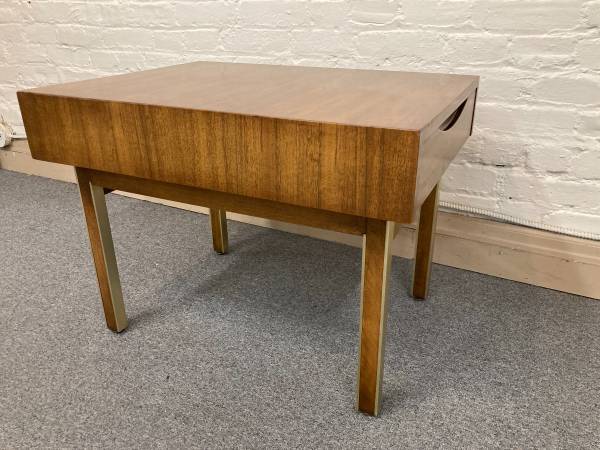 Whatever line it is from, it is a gorgeous and hard to find mid-century modern walnut end table. It has one drawer in front. The legs are rectangular and are clad on two sides with brass strips. It has a stretcher across the front and back for support.
