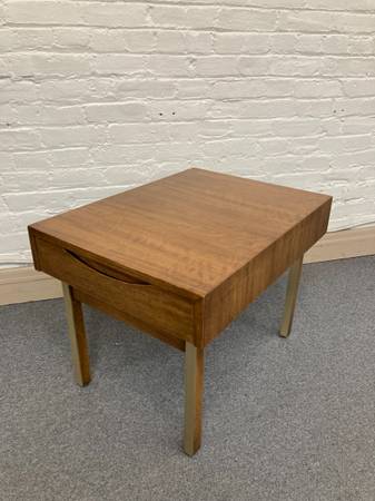 American of Martinsville was founded in 1906 and is a still in business today as a division of Akin Furniture. This is one of the most rare end tables by American of Martinsville. It is from the late 1960s to early 1970s. It was designed by Merton Gershun. He was a prolific designer of American mid-century modern furniture. His most well known lines for American of Martinsville are the Dania and Accord lines. This end table is neither of those and extensive research has failed to uncover the name of the line.