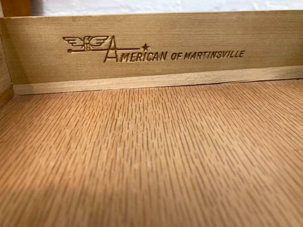 It is marked “American of Martinsville” in the drawer. Underneath is the key to its line name with the stencil “600-27 / LOT 210”.