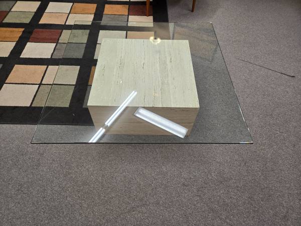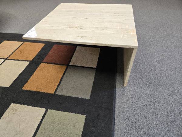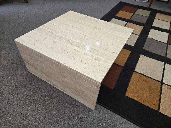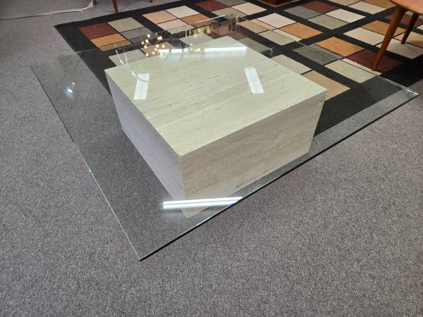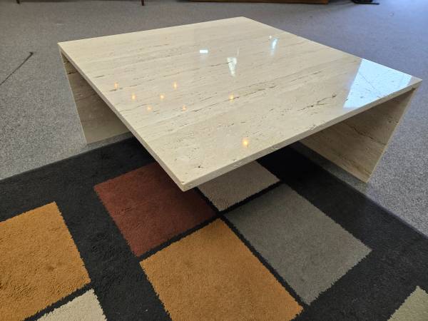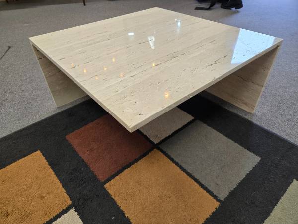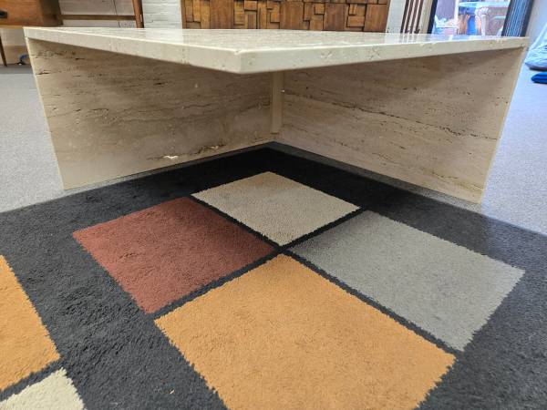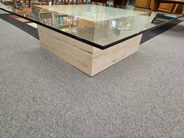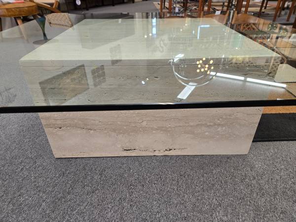 This is a very cool and unusual coffee table, probably from the late 1970s or 1980s. It is unmarked so we don’t know who made it. Typically, with pieces like this the natural travertine stone is from Italy.