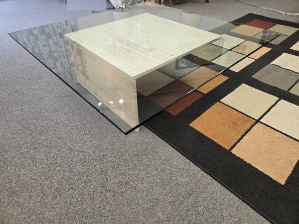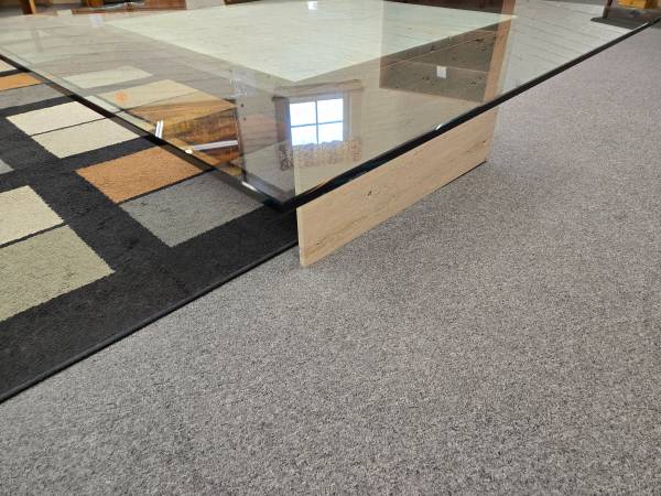 This table features three slabs of travertine stone connected together to make a table base. A thick glass slab can be centered or set off center.