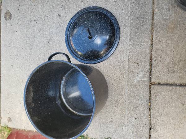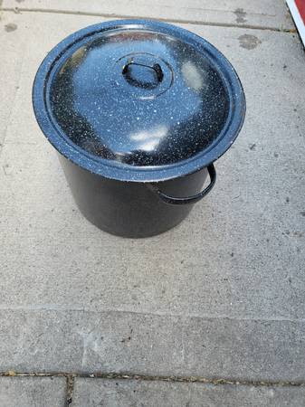 Has a porcelain enamel surface over a steel core body. The steel core is an excellent heat conductor and gives an even heat distribution for faster cooking times. The glass-like enamel surface does not interact with foods and cleans up easily with warm soapy water. Black with white specks. 10.5'' wide x 10'' deep. If you are reading this, then I STILL HAVE IT.