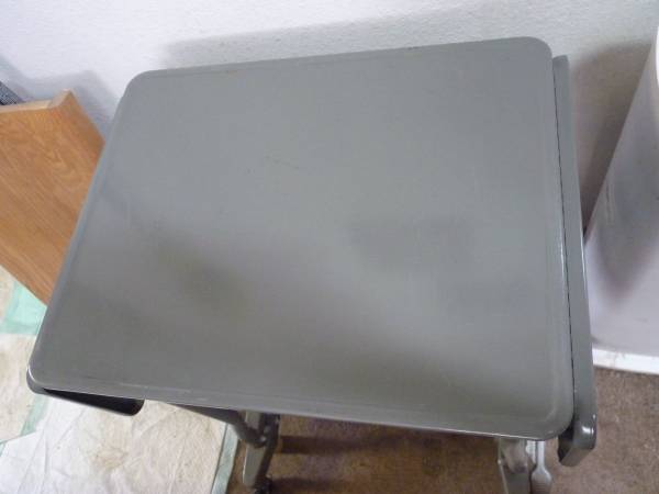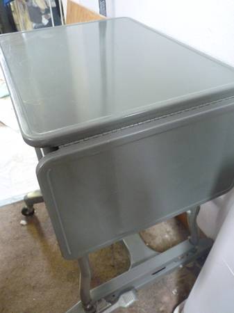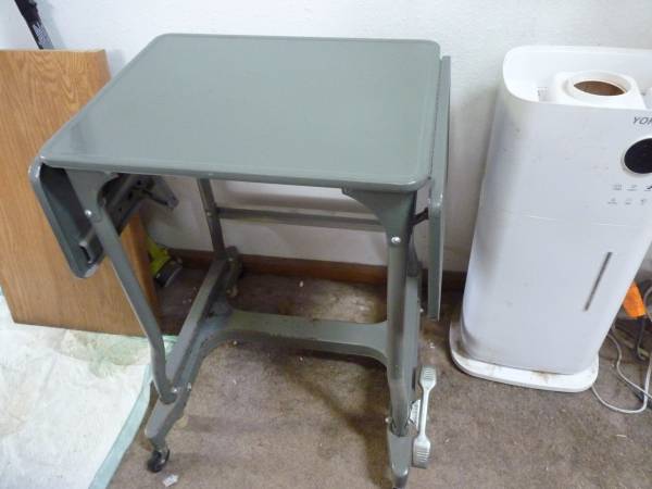 Vintage Gray Metal Typewriter table The table is 19 by 15 plus each leaf is 8 1/2 inches The top and most of the metal is in great condition. The bottom does have rust spots. I didn't use the locks...