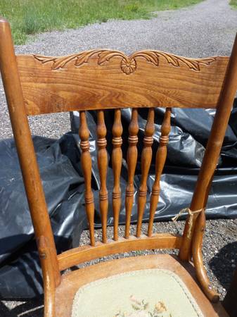 The chair has normal wear but is in good condition for it's age. The seat is a green hand made seat. There is no wood under the fancy seat, This seat needs to be cleaned. It has a water stain