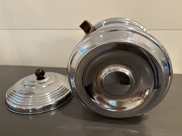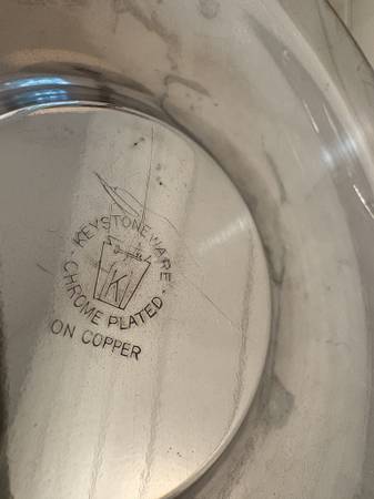 Manufactured between the 1930s and 1950s, based on the materials (chrome over copper, bakelite) and streamlined Art Deco to mid-century design cues. Stamped “Keyware Chrome-Plated on Copper.”