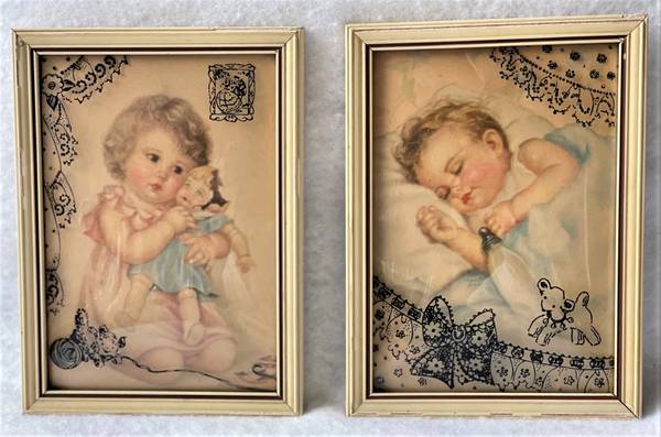 Also available:, 2 pictures of the same era, not labeled, (7 3/4" X 5 3/4") of a sleeping baby and a small girl holding a doll. Painted wood frames and silhouettes of lace curtains and stuffed toys reverse painted on domed glass. Good vintage condition, except for a few small chips to the frames. $10 for set.