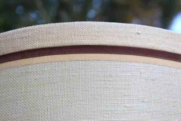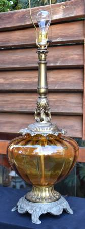 Cool vintage amber glass lamp with shade, works and measures 46" tall to the top of the shade. Cash only please