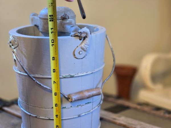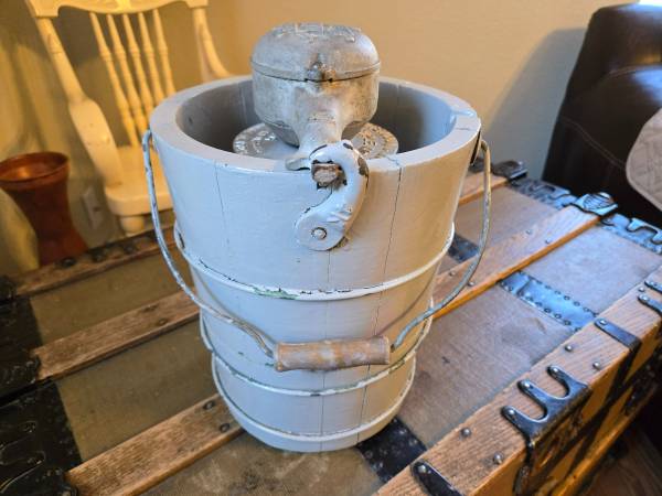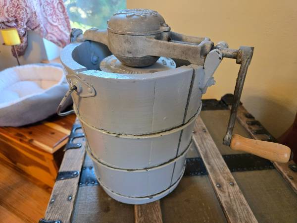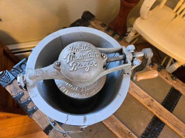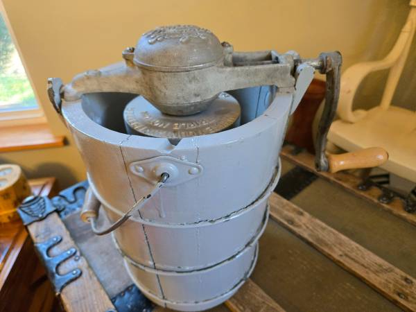 Antique White Mountain “Triple Motion” Ice Cream Freezer. Made in USA and patented in 1923. Features original cast-iron hand crank and wooden bucket with metal bands.
