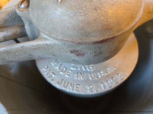 Untested, sold as-is for décor or restoration. Shows age-related wear, surface rust, and wood cracks, as pictured. Crank still turns.