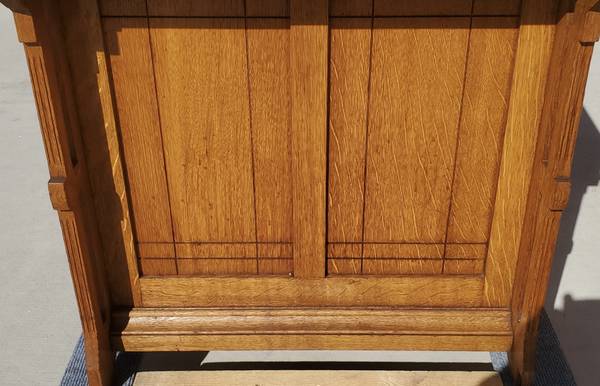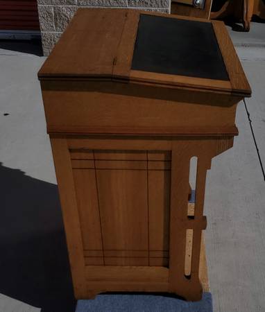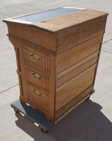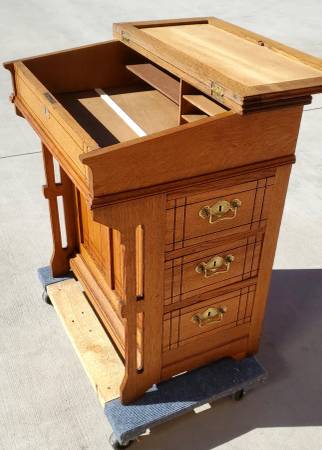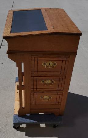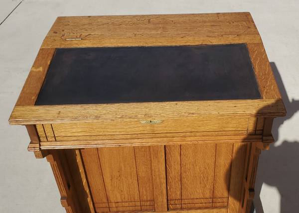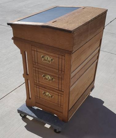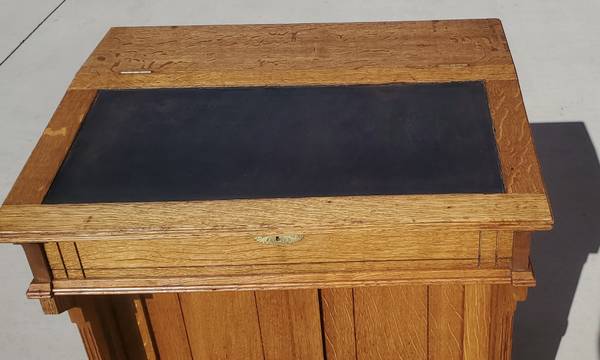 This antique oak Davenport desk was probably made in the early 19th century and is in excellent condition in spite of its age. The desk has a leather slanted top that lifts up and has some cubbies and storage underneath. It was originally from New York but brought to Colorado years ago. From my research the desk was probably used by ladies as a writing desk. It has 3 drawers on the right side which could have been used for clothing storage or important papers. The desk is 26" wide x 20" deep x 31"high. It has the original drawer pulls and the drawers are dovetailed. The desk has been cleaned and restored and is now ready for a new home. If interested call Sharon at the number listed in the reply box. (Seven One Nine-488-Three Seven Seven Eight). This is a land line so will not accept texts. I do not respond to emails or texts and will delete this ad as soon as it is sold. Check out my other postings by clicking on the "more ads by this user" box on the right side of the ad under the map. Cash only please! Thanks for looking!
