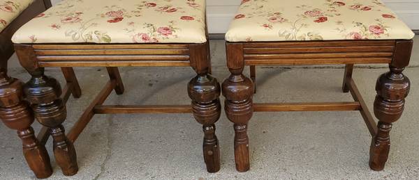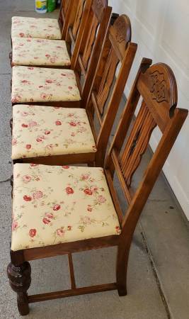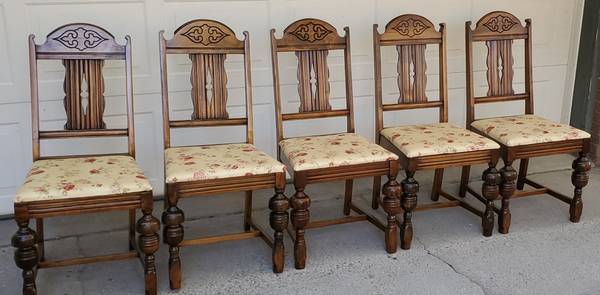 This set of 5 Jacobean style dining room chairs were probably made in the 1930's. They have been re-glued and restored back to their original finish and the seats have been reupholstered and now are ready for a new home. I have two Jacobean tables that are listed separately that these chairs could be use with. The chair seats are 18"wide and 18"high and the backs are 38"high. If interested call Sharon at the number listed in the reply box. (Seven One Nine-488-Three Seven Seven Eight). This is a land line so will not accept texts. I do not respond to emails or texts and will delete this ad as soon as it is sold. Check out my other postings by clicking on the "more ads by this user" box on the right side of the ad under the map. Cash only please! Thanks for looking!
