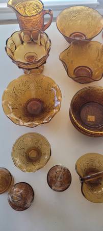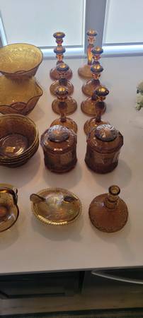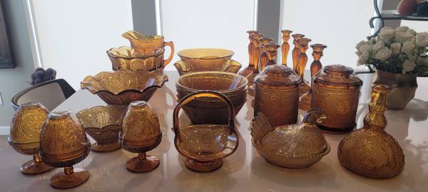 Includes many pieces of Indiana Glass Tiara Amber, plus other Sandwich Glass style pieces as shown in photos.