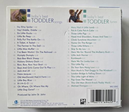 Set of 2 toddler music CDs—perfect for playtime, car rides, and singalongs! • 20 Best Toddler Songs and 20 Best Toddler Tunes • Classic nursery rhymes and upbeat tracks children love