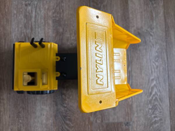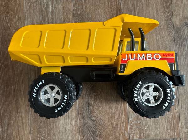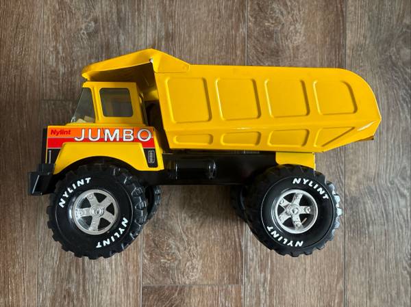 This vintage 1960's Nylint Yellow Jumbo Dump Truck is a classic toy vehicle made of pressed steel with original rubber tires. The dump truck features a vibrant yellow color and is suitable for both boys and girls aged 4-7. With its sturdy construction and iconic design, this Nylint dump truck is sure to bring joy and hours of imaginative play to any child. Never played with, but has a few really tiny paint chips from manufacturing error. Perfect for birthday, Christmas, or vintage toy collector.