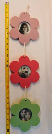 Flower Farmhouse Picture Photo Frames Vertical Hanging. Excellent condition. $10 Cash only. Pre-owned. Please refer to photos, description and measurements. Adorable on the wall. Three flower frames. Each flower measures approx. 6" across. Internal diameter is approx. 2.5". Total length is 24"L.