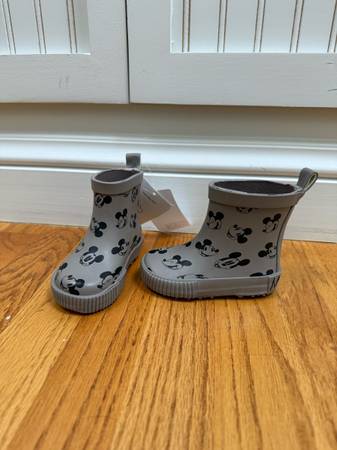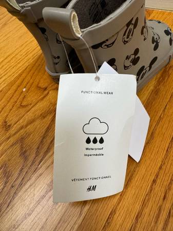 Brand new, never worn, with tags. From H&M store, these have Mickey Mouse faces printed all over them. Awesome looking rain boots, just didn't get to use them before they were grown out of. Regular retail price was $25.