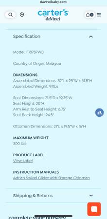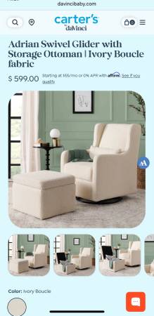 Perfect, compact size glider for a nursery in excellent working condition. Purchased new in 2023. Cozy textured fabric is in good condition, minor wear on ottoman. See photos for size dimensions. Currently sells new for $600. Smoke-free, pet-friendly home.