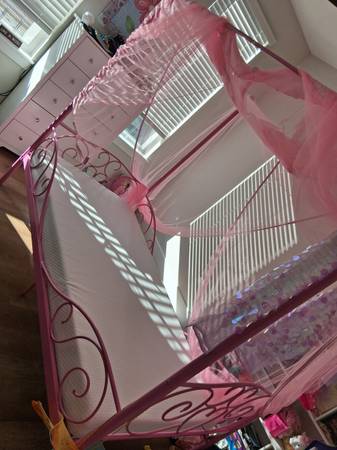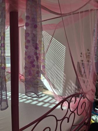 Includes sturdy assembled bed frame, newer memory foam mattress, memory foam padding layer, waterproof mattress cover, canopy curtains and is in like new condition. Twin Size.