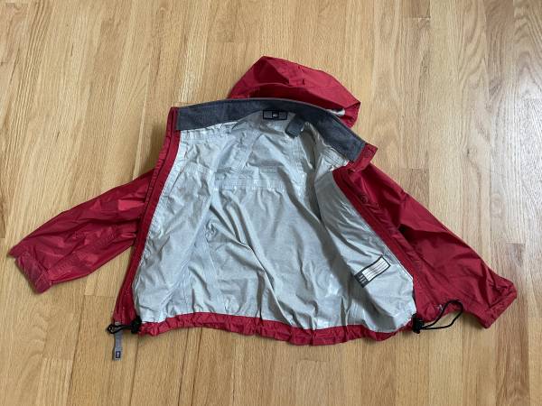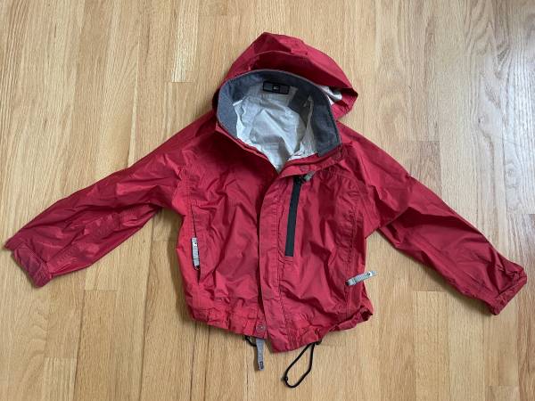 Kid’s REI raincoat Size XS (4/5) fits well from about 3-6 Velcro cuffs Elastic hem with bungee drawstring Stowable hood 2 exterior hand pockets and a chest pocket Non-smoking home